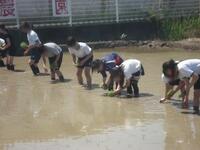 地域応援団2名の方々のサポートを受けながらも、5年生が田植え体験をしました。田んぼの中へ一歩踏み出す感じは、やっぱり今年も「キャー!!」でした。
